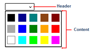 C1DropDown コントロールは、ヘッダー領域とコンテンツ領域の2つのパーツで構成されます。ヘッダーはドロップダウンボックスが開いていないときに表示され、コンテンツはドロップダウン領域をクリックすると表示されます。次の図に、この2つのセクションを示します。