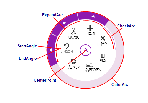 C1RadialMenuItem のデフォルトコントロールテンプレートに形状パスを描画するためのプロパティがいくつかあります。デフォルトでは、C1RadialPanel によってこれらのプロパティが設定されますが、C1RadialPanel で明示的にプロパティを設定することで、カスタムコントロールテンプレートを作成することもできます。