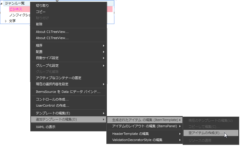 デフォルトテンプレートのほかに、C1TreeView コントロールには追加のテンプレートがいくつかあります。これらの追加テンプレートには、Microsoft Expression Blend からもアクセスできます。Blend で C1TreeView コントロールを選択し、メニューから[追加テンプレートの編集]を選択します。テンプレートを選択し、[空のテンプレートの作成]を選択します。