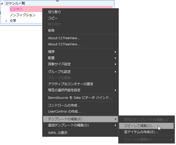 テンプレートにアクセスするには、Microsoft Expression Blend で、C1TreeView コントロールを選択し、メニューから[テンプレートの編集]を選択します。[コピーの編集]を選択して現在のテンプレートのコピーを作成して編集するか、[空のテンプレートの作成]を選択して新しい空のテンプレートを作成します。
