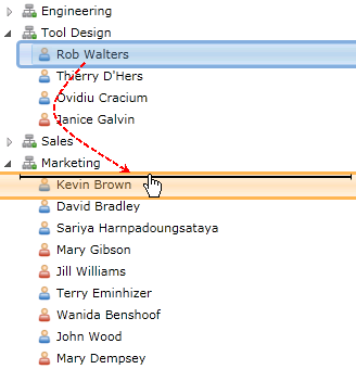 AllowDragDrop プロパティが True に設定されている場合は、C1TreeViewItem をノード、ノードの間、または1つのツリーから別のツリーにドラッグ&ドロップすることができます。