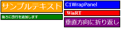 | <Border Margin="2" BorderBrush="Black" BorderThickness="2" Background="Orange"> <HyperlinkButton Foreground="White" Content="サンプルテキスト" FontSize="25" /> </Border> <Border Margin="2" BorderBrush="Black" BorderThickness="2" Background="Green" Xaml:C1WrapPanel.BreakLine="After"> <HyperlinkButton Foreground="White" Content="後ろに改行を追加します" /> </Border> <Border Margin="2" BorderBrush="Black" BorderThickness="2" Background="Blue"> <HyperlinkButton Foreground="White" Content="C1WrapPanel" FontSize="16"/> </Border> <Border Margin="2" BorderBrush="Black" BorderThickness="2" Background="Red"> <HyperlinkButton Foreground="White" Content="垂直方向に折り返し" /> </Border> <Border Margin="2" BorderBrush="Black" BorderThickness="2" Background="Purple"> <HyperlinkButton Foreground="White" Content="WinRT" FontSize="20"/> </Border> |
