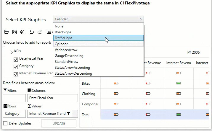 For each KPI in the OLAP cube, there is a corresponding measure for its status and trend. The associated graphics of each KPI can be specified using the KpiGraphics enumeration. In the code below, a Combo Box is used to display the KpiGraphics enumeration values to alter the KPI graphics at runtime. The selected graphics can be applied to the KPI fields using the C1KpiField class of C1.FlexPivot.Internal namespace.