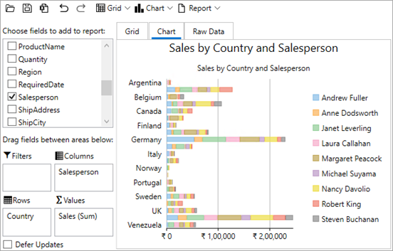 ドリルダウン機能を使用すると、階層内の下位レベルに置かれた構造化データベースにアクセスできます。FlexPivot コントロールでデータベースをドリルダウンして、グリッドに表示された各集計値の基底のレコードを確認することができます。セルをダブルクリックするだけで基底のレコードを表示できます。