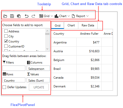 FlexPivotPage is designed for quick and easy development of FlexPivot applications. The FlexPivotPage control provides a comprehensive user interface (UI) for FlexPivot applications. FlexPivotPage comprises a tool strip at the top with commonly used commands, FlexPivotPanel on the left and tabbed region on the right. The FlexPivotPanel control allows users to select and customize data fields. The tabbed region contains Grid, Chart and Raw Data tabs to display data in different forms.