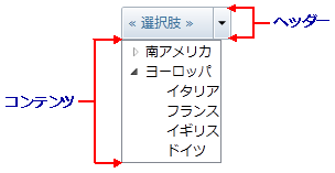 <c1:C1DropDown Height="36" HorizontalAlignment="Left" Margin="10,12,0,0" Name="C1DropDown1" VerticalAlignment="Top" Width="101"> <c1:C1DropDown.Header> <TextBlock Height="21" Name="TextBlock1" Text="≪ 選択肢 ≫" Width="120" /> </c1:C1DropDown.Header> <c1:C1DropDown.Content> <TreeView HorizontalAlignment="Left" Name="TreeView1" Width="120"> <TreeViewItem Header="南アメリカ"> <TreeViewItem Header="ブラジル" /> <TreeViewItem Header="アルゼンチン" /> <TreeViewItem Header="ウルグアイ" /> </TreeViewItem> <TreeViewItem Header="ヨーロッパ"> <TreeViewItem Header="イタリア" /> <TreeViewItem Header="フランス" /> <TreeViewItem Header="イギリス" /> <TreeViewItem Header="ドイツ" /> </TreeViewItem> </TreeView> </c1:C1DropDown.Content> </c1:C1DropDown> |