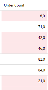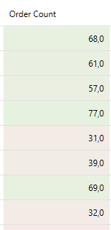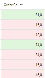 In the above example, the color scale rule is applied to the OrderCount column based on the values in each cell. Two color stops are defined in the rule: one at a value of 0 with a light red color and one at a value of 100 with light green color. When the rule is evaluated, it interpolates the background of each value. If the value is closer to 0 it will appear towards the red spectrum and if the value is closer to 100 it will appear towards the green, hence creating a visual gradient that helps the user to assess the magnitude of the value.