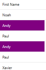 The example code above defines a custom rule in the FirstName column. In the XAML part, RulesEngineCustomRule targets the field FirstName and applies logic defined in the GetFirstNameStyle method. The corresponding GetFirstNameStyle method written in C# checks if the value of the FirstName field equals Andy. If the condition is true, the background is set to purple, and the foreground is set to white.