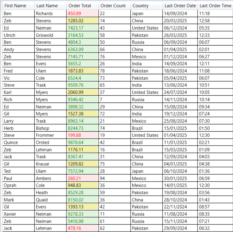<DataGrid x:Name="grid" AutoGenerateColumns="False" Grid.Column="0" SelectionChanged="grid_SelectionChanged"> <DataGrid.Columns> <DataGridTextColumn Binding="{Binding FirstName}" Header="First Name"/> <DataGridTextColumn Binding="{Binding LastName}" Header="Last Name"/> <DataGridTextColumn Binding="{Binding OrderTotal}" Header="Order Total"/> <DataGridTextColumn Binding="{Binding OrderCount}" Header="Order Count"/> <DataGridTextColumn Binding="{Binding CountryId, Converter={StaticResource CountryConverter}}" Header="Country"/> <DataGridTextColumn Binding="{Binding LastOrderDate, StringFormat={}\{0:dd/MM/yyyy\}}" Header="Last Order Date"/> <DataGridTextColumn Binding="{Binding LastOrderDate, StringFormat={}\{0:hh:mm\}}" Header="Last Order Time"/> </DataGrid.Columns> <DataGrid.CellStyle> <Style TargetType="DataGridCell" BasedOn="{StaticResource {x:Type DataGridCell}}"> <Setter Property="Background"> <Setter.Value> <MultiBinding Converter="{StaticResource valueConverter}" ConverterParameter="Background"> <Binding RelativeSource="{RelativeSource Self}" /> <Binding RelativeSource="{RelativeSource Mode=FindAncestor, AncestorType=DataGrid}" /> <Binding Source="{StaticResource rulesEngine}" /> </MultiBinding> </Setter.Value> </Setter> <Setter Property="Foreground"> <Setter.Value> <MultiBinding Converter="{StaticResource valueConverter}" ConverterParameter="Foreground"> <Binding RelativeSource="{RelativeSource Self}" /> <Binding RelativeSource="{RelativeSource Mode=FindAncestor, AncestorType=DataGrid}" /> <Binding Source="{StaticResource rulesEngine}" /> </MultiBinding> </Setter.Value> </Setter> </Style> </DataGrid.CellStyle> </DataGrid> |