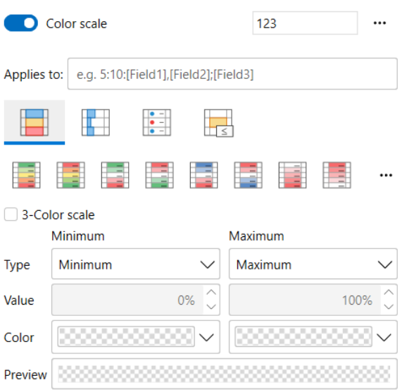 Color scale rule is defined by a collection of color stops. Based on the value of the item being evaluated and the color stops, the rule applies a style with a background color that is interpolated according to the value. As a result, each item’s style varies from each other, providing a value-based visual representation. It also displays a range of presets with common standard colors and a zone to specify the values that determine the applied background from the scale.