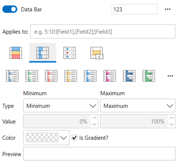 Data-bar rule causes the items to show a visual bar indicating the value of the item. It has a list of presets and a section to specify the values used to calculate the length of the bar and the color of the bar.