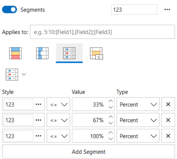 The segments rule defines a series of segments, and every segment has a style, depending on the value of the item the corresponding segment is taken, and its style is applied to the item. This rule can be used to display icons depending on the value, but at the same time can be used to paint the background with static brushes (unlike color-state rule, which interpolates the colors).