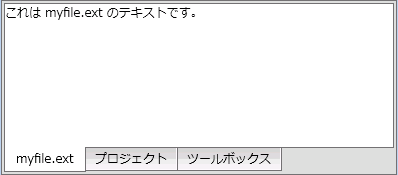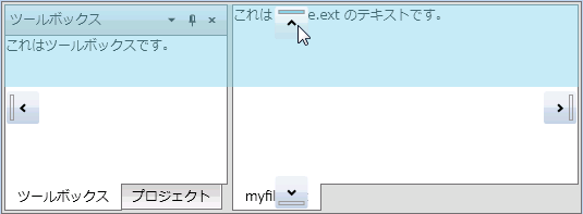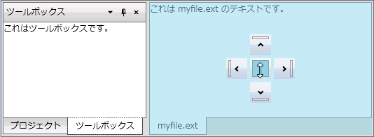 上の画像例の状態で、中央のインジケータ上でマウスのボタンを放すと、myfile.ext C1DockTabItem と他の C1DockTabItems が最初の C1DockTabControl に表示されます。