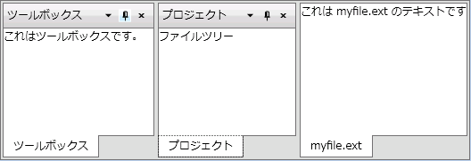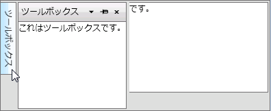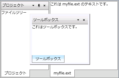 <c1:C1DockTabControl DockMode="Floating"> <c1:C1DockTabItem Header="ツールボックス"> <TextBlock Text="これはツールボックスです。" /> </c1:C1DockTabItem> </c1:C1DockTabControl> |