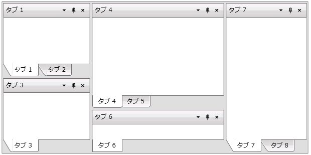 <c1:C1DockControl x:Name="dockControl" Margin="-128,0,12,127"> <c1:C1DockGroup> <c1:C1DockTabControl Dock="Top"> <c1:C1DockTabItem Header="タブ 1" TabShape="Sloped"> <!--ここにコンテンツを配置--> </c1:C1DockTabItem> <c1:C1DockTabItem Header="タブ 2" TabShape="Sloped"> <!--ここにコンテンツを配置--> </c1:C1DockTabItem> </c1:C1DockTabControl> <c1:C1DockTabControl> <c1:C1DockTabItem Header="タブ 3" TabShape="Sloped" > <!--ここにコンテンツを配置--> </c1:C1DockTabItem> </c1:C1DockTabControl> </c1:C1DockGroup> <c1:C1DockGroup> <c1:C1DockTabControl Dock="Top" DockWidth="500" DockHeight="500" TabItemShape="Rounded"> <c1:C1DockTabItem Header="タブ 4"> <!--ここにコンテンツを配置--> </c1:C1DockTabItem> <c1:C1DockTabItem Header="タブ 5"> <!--ここにコンテンツを配置--> </c1:C1DockTabItem> </c1:C1DockTabControl> <c1:C1DockTabControl> <c1:C1DockTabItem Header="タブ 6"> <!--ここにコンテンツを配置--> </c1:C1DockTabItem> </c1:C1DockTabControl> </c1:C1DockGroup> <c1:C1DockTabControl> <c1:C1DockTabItem Header="タブ 7" TabShape="Sloped"> <!--ここにコンテンツを配置--> </c1:C1DockTabItem> <c1:C1DockTabItem Header="タブ 8" TabShape="Sloped"> <!--ここにコンテンツを配置--> </c1:C1DockTabItem> </c1:C1DockTabControl> </c1:C1DockControl> |