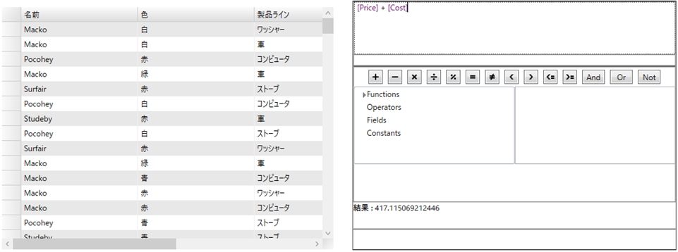 Expression Editor は、FlexGrid コントロールとの統合をサポートします。Expression Editor をグリッドと統合すると、式を使用してグリッドデータのフィルタ処理、グループ化、ソート、列計算などの演算を実行できます。