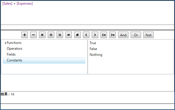 Expression Editorは、演算の実行対象となるデータを表すクラスのインスタンスに連結できます。それには、C1ExpressionEditor クラスが公開する DataSource オブジェクトを使用します。