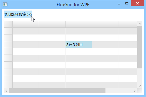 private void Button_Click_1(object sender, RoutedEventArgs e) { //3行3列目のセルに値を設定します。(インデックスは0からです) C1FlexGrid[3, 3] = "3行3列目"; //セルの移動(選択)を設定します C1FlexGrid.Select(3, 3); }