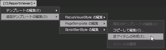 デフォルトテンプレートのほかに、C1ReportViewer コントロールには追加のテンプレートがいくつかあります。これらの追加テンプレートには、Microsoft Expression Blend からもアクセスできます。Blend で C1ReportViewer コントロールを選択し、メニューから[追加テンプレートの編集]を選択します。テンプレートを選択し、[空アイテムの作成]を選択します。
