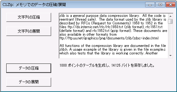 プロジェクトを実行し、[データの圧縮]/[データの圧縮解除]ボタンをクリックすると、データが 14,125 バイトの配列に保存されることがわかります。このデータを通常のストリームに保存する場合は、28,004 バイト(4 + 1000 * (4 + 8 * 3))が必要です。このため、元のサイズの約半分の大きさに圧縮されたことになります。