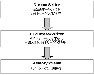 C1ZStreamWriter オブジェクトは、バイトデータとバイト配列を書き込むための基本ストリームメソッドを提供するだけです。文字列や整数などの他の基本型を書き込むには、StreamWriter オブジェクトを C1ZStreamWriter にアタッチします。次の図に、この関数の動作を示します。