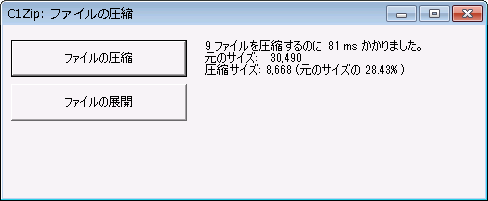 重要な行は、ユーティリティ関数 CompressFile の呼び出しです。ここで、選択されたファイルをそれぞれ圧縮します。圧縮ファイルは、アプリケーションフォルダにある ¥compressed ディレクトリに保存されます。ファイル名は、元のファイルの名前に拡張子 CMP が付加された名前になります。