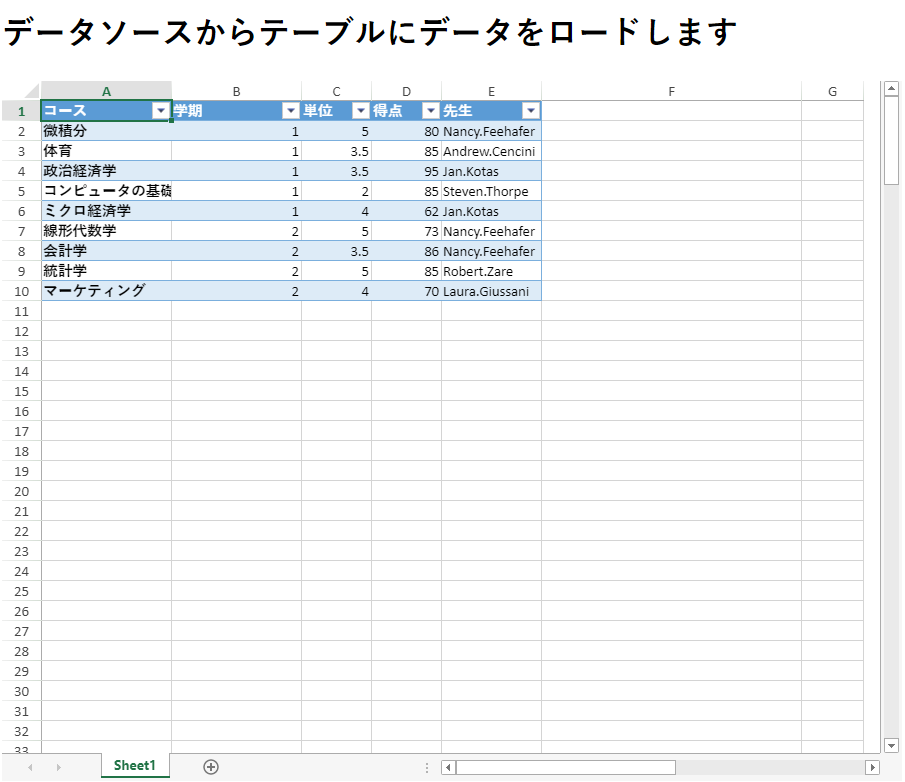 //1:- createSampleData()を作成します。 function createSampleData() { // サンプルレポートカードを作成します。 return [ { コース : "微積分", 学期: 1, 単位 : 5, 得点: 80, 先生: "Nancy.Feehafer", }, { コース : "体育", 学期: 1, 単位 : 3.5, 得点: 85, 先生: "Andrew.Cencini", }, { コース : "政治経済学 ", 学期: 1, 単位 : 3.5, 得点: 95, 先生: "Jan.Kotas", }, { コース : "コンピュータの基礎", 学期: 1, 単位 : 2, 得点: 85, 先生: "Steven.Thorpe", }, { コース : "ミクロ経済学", 学期: 1, 単位 : 4, 得点: 62, 先生: "Jan.Kotas", }, { コース : "線形代数学", 学期: 2, 単位 : 5, 得点: 73, 先生: "Nancy.Feehafer", }, { コース : "会計学", 学期: 2, 単位 : 3.5, 得点: 86, 先生: "Nancy.Feehafer", }, { コース : "統計学", 学期: 2, 単位 : 5, 得点: 85, 先生: "Robert.Zare", }, { コース : "マーケティング", 学期: 2, 単位 : 4, 得点: 70, 先生: "Laura.Giussani", }, ]; } |