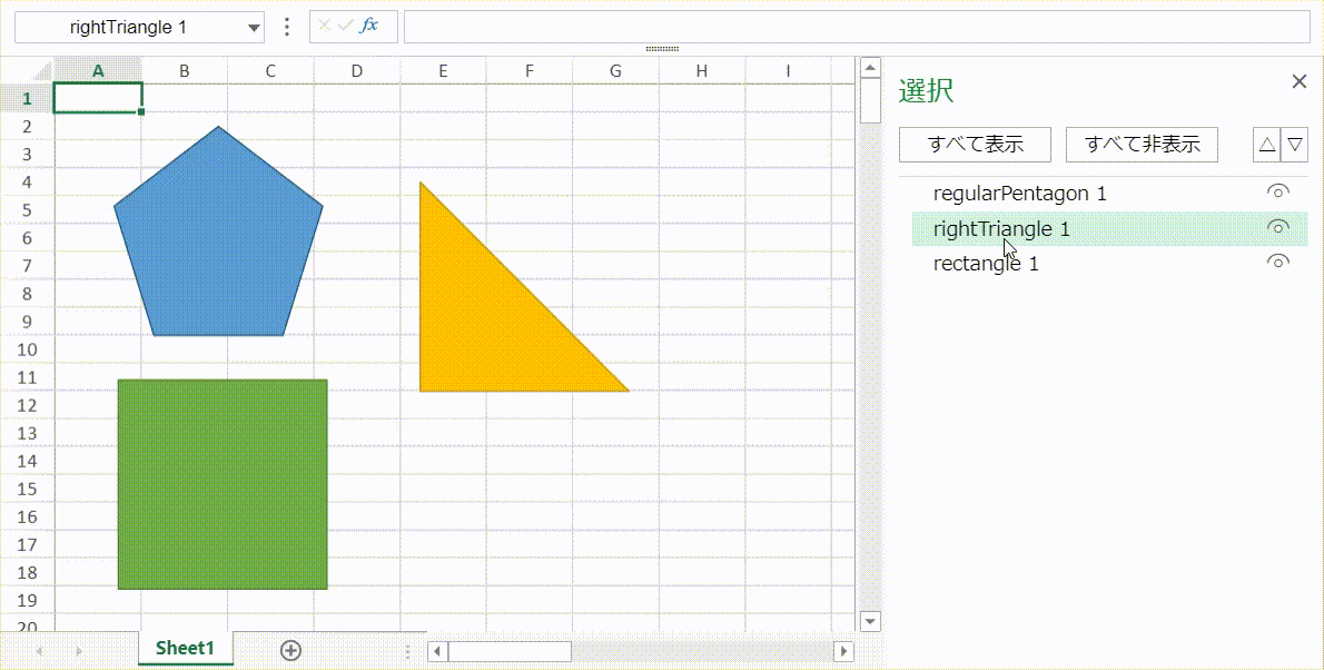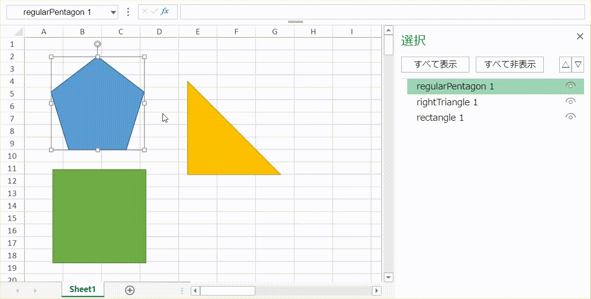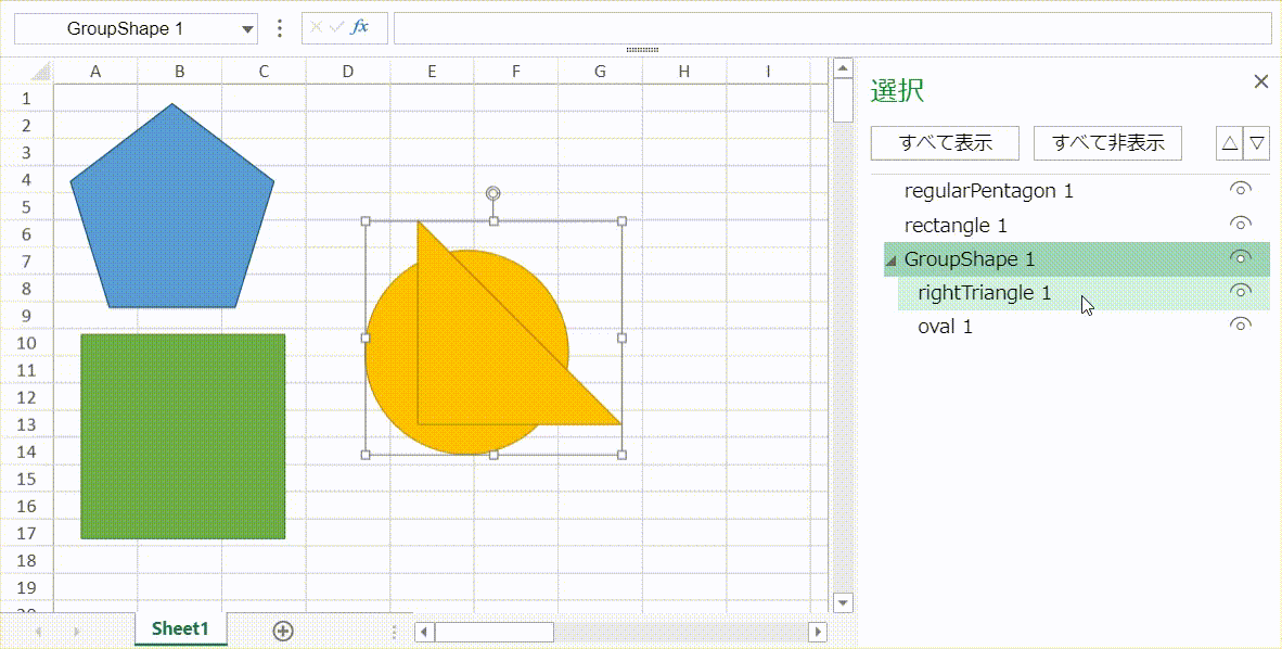 オブジェクトの選択と表示でシェイプの名前をクリックして、ワークシート内の該当するシェイプを選択することができます。選択されたシェイプ名の背景が緑色になり、強調表示されます。