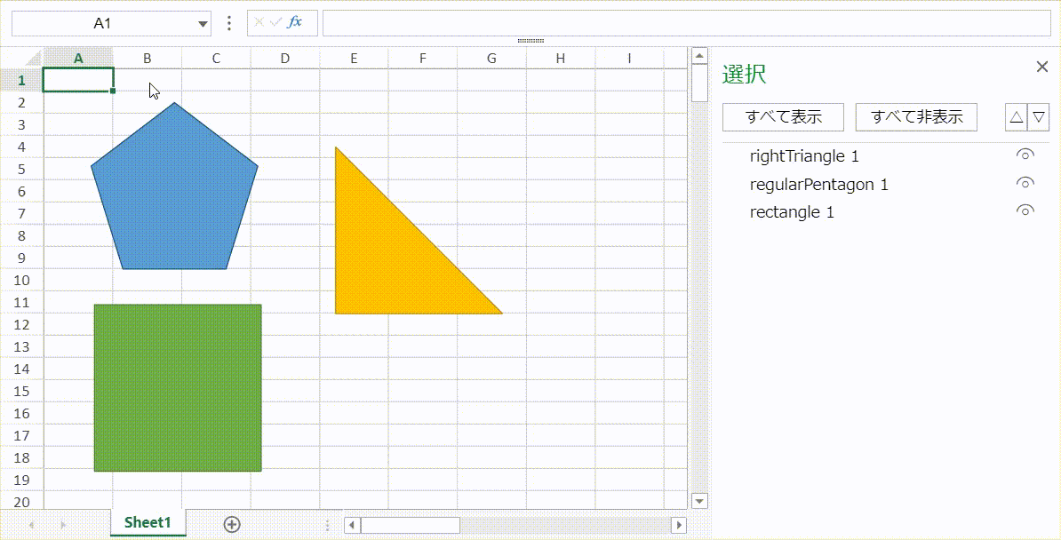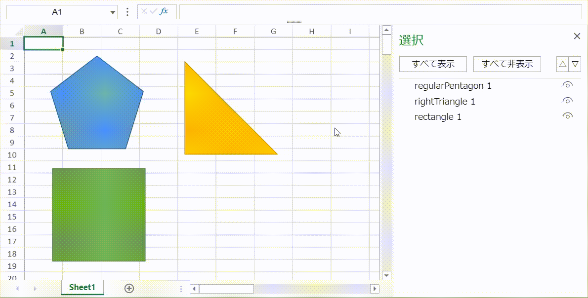 選択ペインで表示される[すべて表示]や[すべて非表示]のオプションを選択することで、ワークシート内のシェイプをすべて表示・非表示にすることができます。