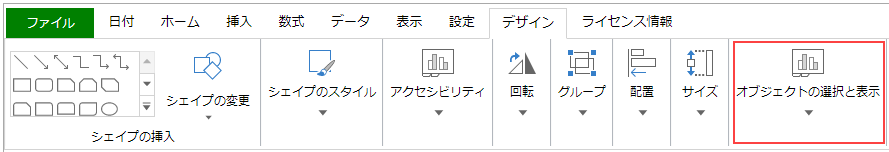オブジェクトの選択と表示は、ワークシート内の複数のシェイプを管理および配置するために使用されるサイドパネルです。 このパネルにシェイプ向けの[デザイン]タブからアクセスできます。