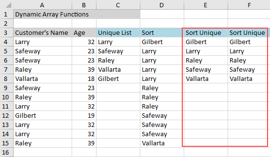 たとえば、セルD4で設定されている数式「=SORT(A4:A15)」が、昇順で並べ替えられている顧客名を返します。