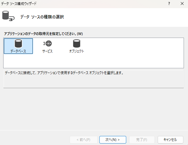 データソースの種類として「データベース」を選択し、[次へ]をクリックします。
