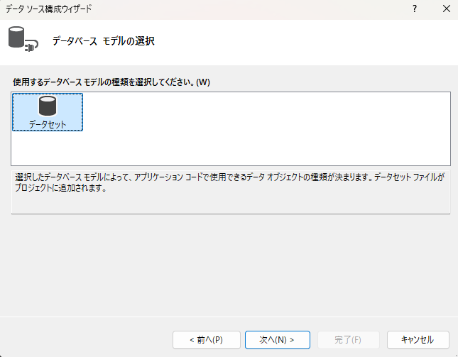 データベース モデルとして「データセット」を選択し、[次へ]をクリックします。