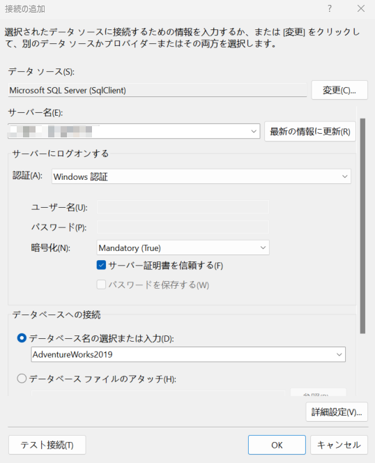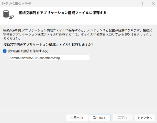 接続文字列を「AdventureWorks2019ConnectionString」の名前で保存し、[次へ]をクリックします。