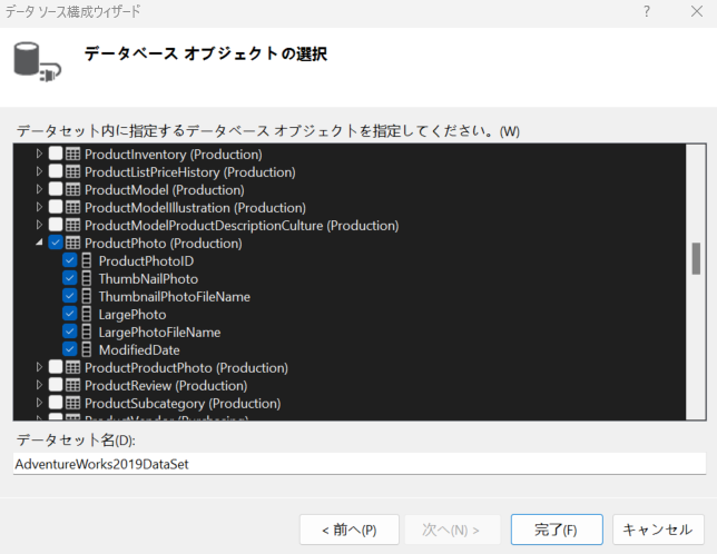 データベース オブジェクトとして ProductPhoto テーブルを選択し、[完了]をクリックします。