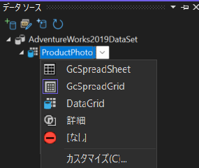 データソースの ProductPhoto テーブルを選択してドロップダウン ボタンを押します。ドロップダウン リストから「GcSpreadGrid」を選択します。