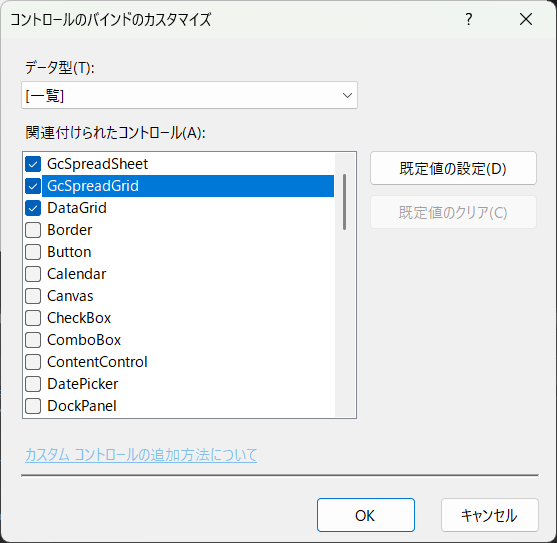 4.(任意)ドロップダウンリストに[GcSpreadGrid]が表示されない場合は、[カスタマイズ]を選択して[コントロールバインドのカスタマイズ]ダイアログを開きます。[関連付けられたコントロール]セクションで[GcSpreadGrid]を選択し、[OK]をクリックします。
