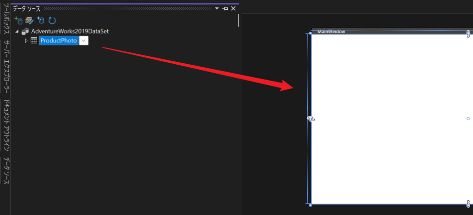 データソースの ProductPhoto テーブルを MainWindow.xaml にドラッグ&ドロップします。