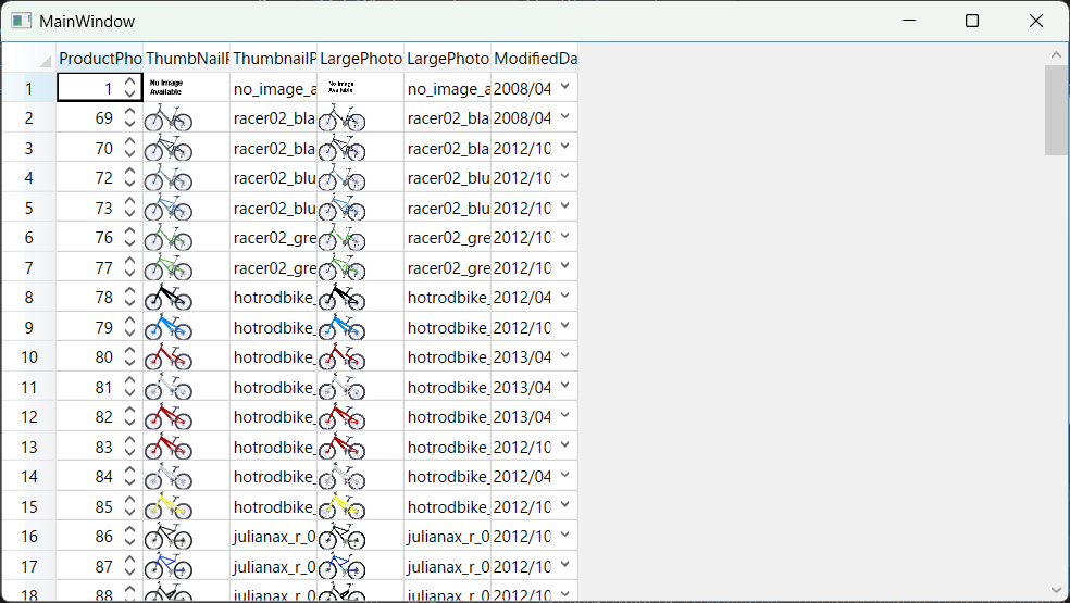 Visual Studio[デバッグ]メニューから[デバッグ開始]を選択すると、ProductPhoto テーブルのデータが GcSpreadGrid コントロールに表示されます。